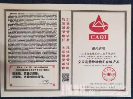 AQI中国质量检验认证专家组对江苏老裁缝家纺工业有限公司产品“老裁缝家纺”整体套房,席梦思床垫、窗帘、软床、床上用品等家纺、家居产品自2016年1月至2019年1月3年调查汇总证明属于全国质量检验稳定合格产品荣誉。
