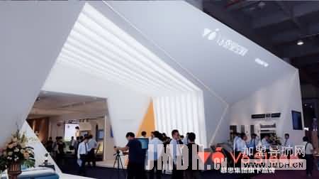 一走近V6卧室空间展台,一个时尚又不乏温馨的家居空间映入眼帘。渐变的科技射线,不规则的菱形组合。V6的展厅秉持V6一贯简约时尚又不失未来感的设计风格。