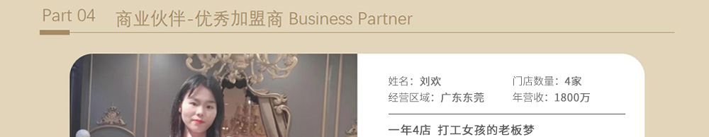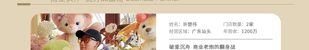 啊伟,是周边人对许楚伟的称呼。作为典型的潮汕人,啊伟一直在生意场上浮沉。几年前投资家纺创业失败,亏了小一百万。彻底颠覆了这位生意老炮的思想“不是大品牌就绝对的好,不是广告多就有实力,合作还是要看人”。加盟莱芙家纺,是啊伟深思熟虑的结果。“口碑、市场沉淀、产品力、企业格局——这些我都了解了一遍,才敢开始做的”。这么多年的商场经验,啊伟很明白,市场上鱼龙混杂,加盟品牌就得有火眼金睛。“这是我最后一次创业了,一定要谨慎的”啊伟坦言。最终选择莱芙家纺,啊伟一直认为是自己的英明之举——“第一家店开了不到一年,我就回本了,还把之前投资失败的欠的账给填平了,所以我才敢开第二家“。”做生意最怕压货,这点莱芙家纺真的不一样,其他品牌派人给你压货,他们家派人帮你卖货“商业老炮啊伟说出了心里话。