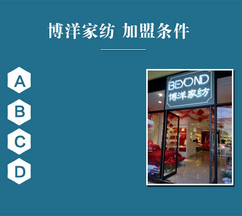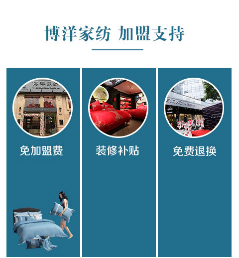 现在加盟博洋家纺享9大优惠加盟支持!免费获取详细加盟优惠政策加盟条件、产品图册、投资详情资料,敬请留言或电话垂询。