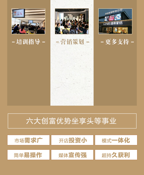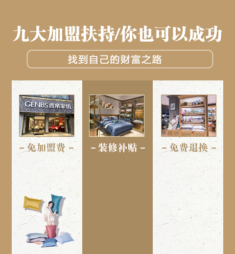 现在加盟晋帛家纺享9 大优惠加盟支持!免费获取详细加盟优惠政策、加盟条件、产品图册、投资详情资料,敬请留言或电话垂询。