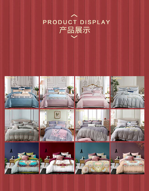 公司产品系列满足各种层次不同喜好的消费群体的需求:有婚庆系列、尊贵系列、优雅系列、浪漫系列、时尚系列、儿童系列、被芯系列、枕芯系列、毛毯系列、家饰系列、夏令用品系列。