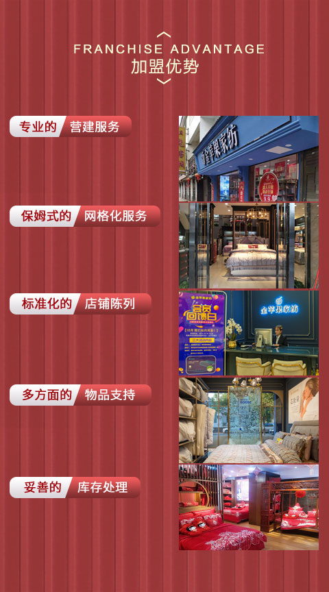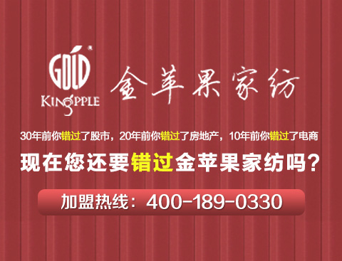 现在加盟金苹果家纺享9大优惠加盟支持!免费获取详细加盟优惠政策、加盟条件、产品图册、投资详情资料,敬请留言或电话垂询。