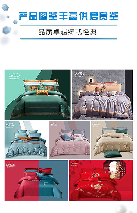 蓝丝羽家纺拥有业内品类最齐全,价格层次最丰富的产品结构,产品分为婚嫁、乔迁、居家素色、儿童、芯垫毯、家居配套等,可满足不同层次消费者的审美及消费需求。