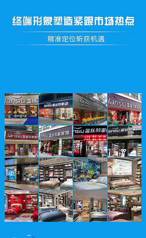 蓝丝羽终端形象设计紧贴品牌和市场定位,努力营造家的氛围,程度上满足消费者对购物环境的需求,同时创造丰富的床品陈列,让您的投入获得更多的盈利机会。2018年,蓝丝羽家纺店面形象全新升级,分为家居馆、标准店、社区店、商超店、精品百货店五种业态门店,满足不同投资成本的需要。