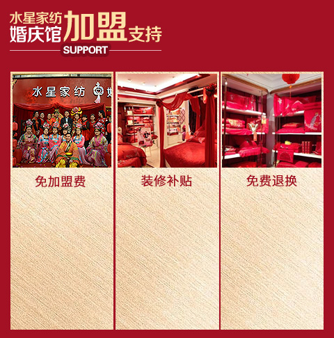 现在加盟水星家纺享9大优惠加盟支持!免费获取详细加盟优惠政策、加盟条件、产品图册、投资详情资料,敬请留言或电话垂询。