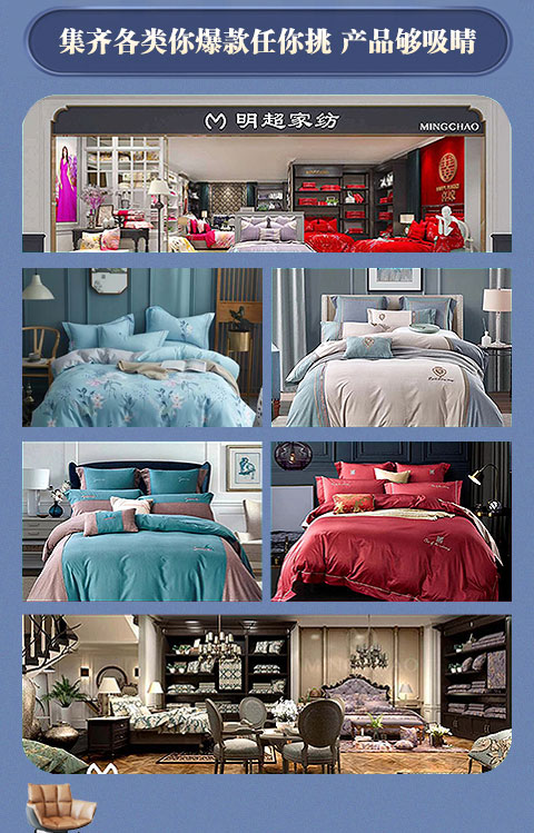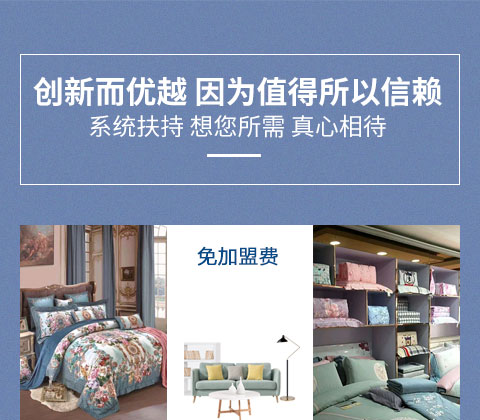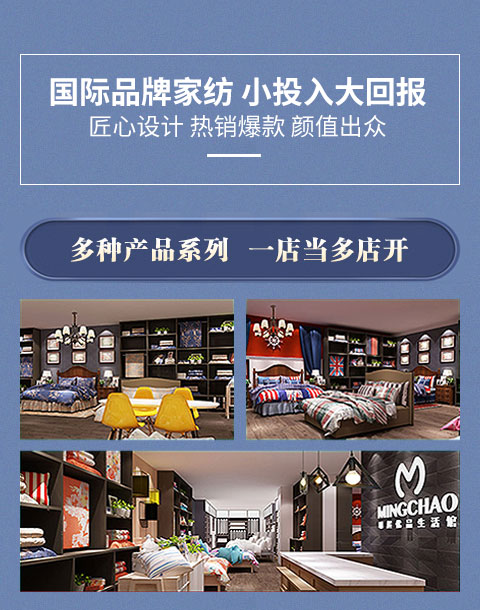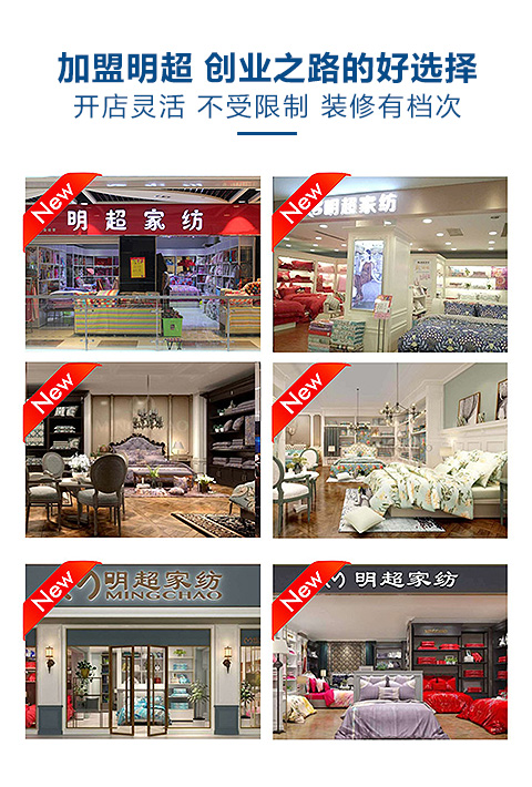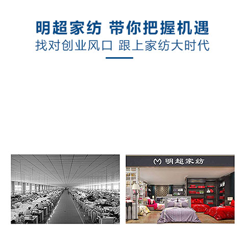 现在加盟明超家纺享 9大优惠加盟支持!免费获取详细加盟优惠政策、加盟条件、产品图册、投资详情资料,敬请留言或电话垂询。