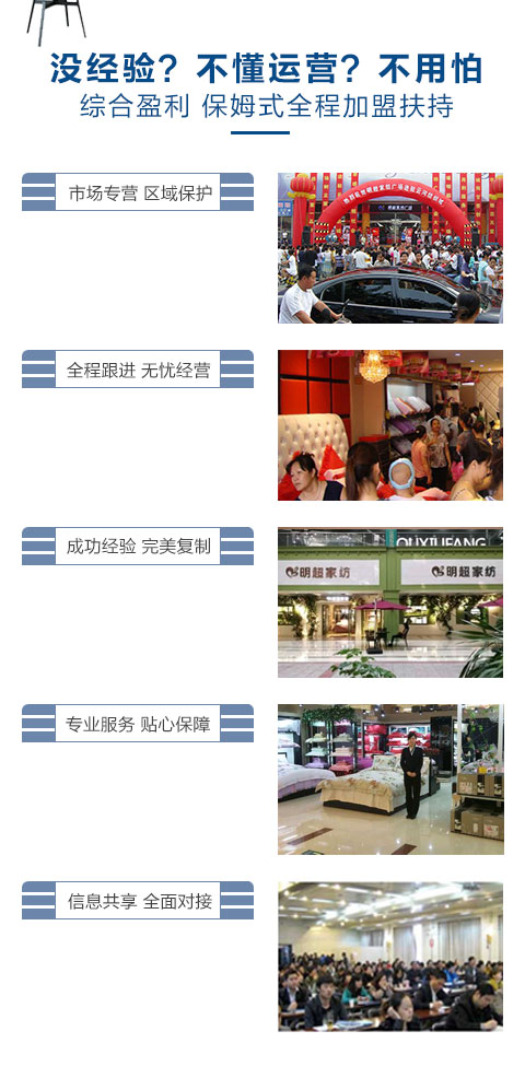 从选址开业到日常经营,明超家纺广场将提供全套的计划和方案,利用科学务实的经营指导让经销商踏踏实实的赚钱。