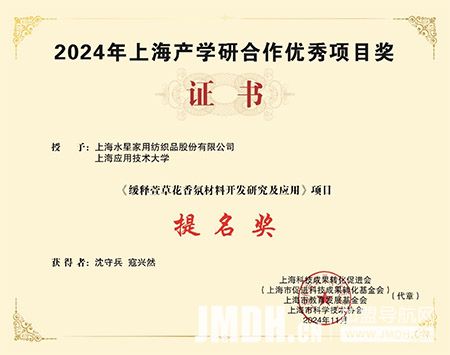 由水星家纺与上海应用技术大学合作的项目《缓释萱草花香氛材料开发研究》获得2024年“上海产学研合作优秀项目奖”提名奖,项目合作的模式及成效受到上海科技成果转化促进会、上海市教育发展基金会、上海市科学技术协会的充分肯定。