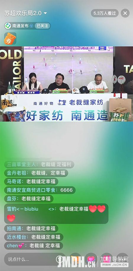 7月19日晚,随着一声热情的开场白——“各位球迷朋友们,晚上好!欢迎来到《苏超欢乐局2.0,有‘被’而来》”,如皋奥体中心与南通发布抖音直播间同步沸腾。
