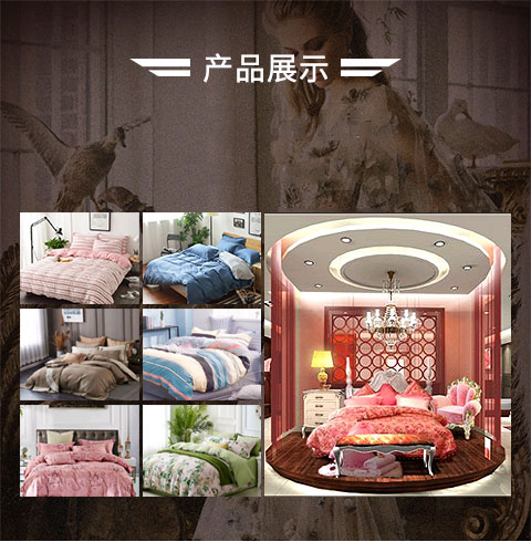 公司目前主要生产:配套床上用品、床罩、被套、被芯、枕芯、床垫、床单、凉席、中药保健床品、窗帘、毛毯、巾类制品等12大类,1000多种花样的床上用品系列产品。