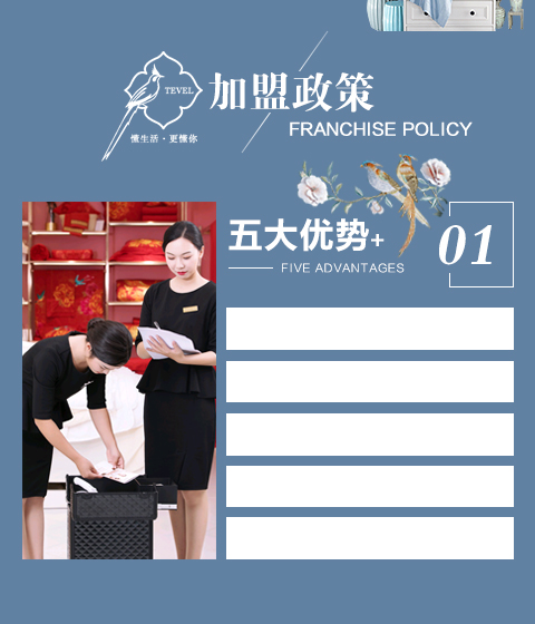 现在加盟堂皇家纺享9大优惠加盟支持!免费获取详细加盟优惠政策、加盟条件、产品图册、投资详情资料,敬请留言或电话垂询。